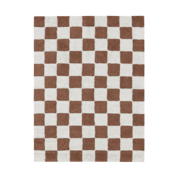Inspired by vintage ceramic floors, the Kitchen Tiles rug features a checkered pattern playing with contrasting natural and toffee colors. The rug used our RugCycled mix / Natural canvas base, leaving the base slightly visible in between the colored squares simulating the kitchen tiles.