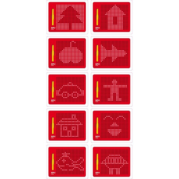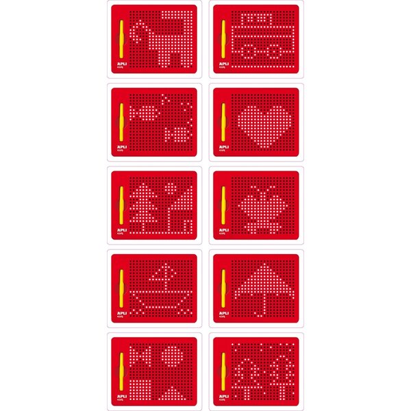 Magnetic board measuring 215 x 12 x 170 mm, in red colour. The board includes a yellow pencil with a metal tip for use on the board. Also included are 10 cards with a total of 20 examples.