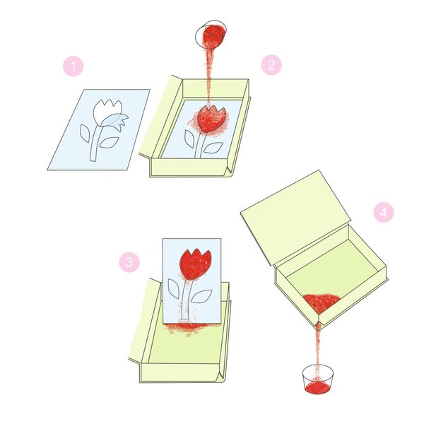 - Content: 4 glue coated cards (150x210mm), 9 coloured sands, 2 tubes of glitters in different colors, 1 spatula and a step by step booklet