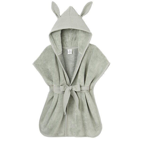 An adorable bamboo terry bathrobe with a hood and tone-on-tone cotton double gauze fabric. Small rabbit ears on the hood. This bathrobe can be opened completely at the front to put your baby in and gently wrap them up after bathing. Once your baby starts to sit or stand, the bathrobe stays in place thanks to the buttoned belt. The Soft Bambou collection combines ultra-soft bamboo terry cloth with double waffle cotton gauze, available in a range of trendy colours. Available in size 0/2 years.