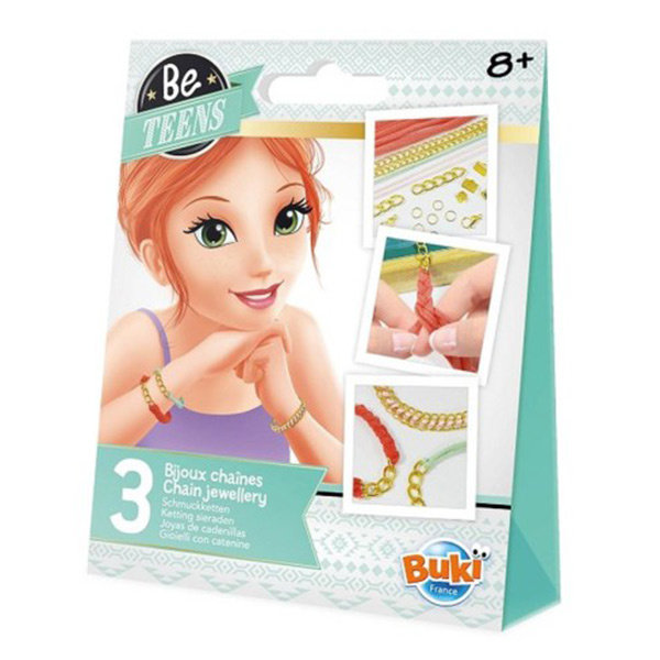 Make trendy bracelets with chains, ribbons and cords! This jewelry set contains all accessories for making 3 bracelets. Super easy and fun creative activity to do. Follow the color illustrated instructions for use. Ideal for gift giving.