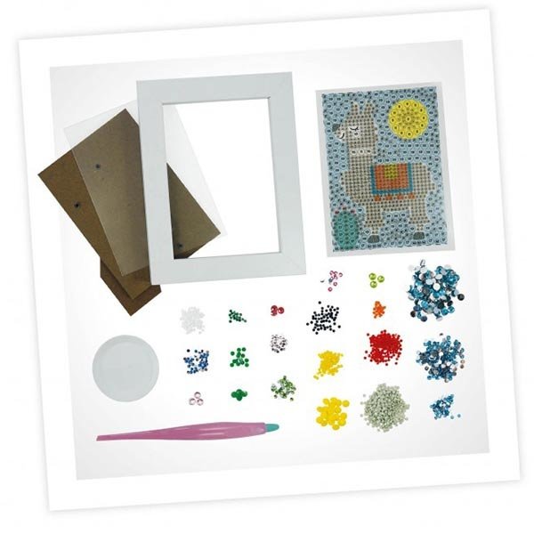 With this craft kit glitters Llama from Buki France, children can make a beautiful glitter painting with decorative stones. Use the special stylus to grab the diamonts and place them on the matching numbers and letters on the self-adhesive board. The board is already adhesive, so no messing with glue. The result is magnificent! Place the glitter painting in the wooden frame and display it in the kids room.