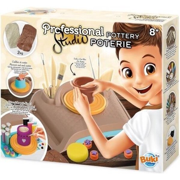 A real pottery wheel especially for children! Thanks to the instructions, children learn how to make a bowl, a pot or a plate, which they can then decorate! Includes: 2 kg of air-drying clay. 1 dose of clay with a light colour and 1 dose of clay with a brown colour. The key to success? A mould to take off the required amount of clay and place the clay on the centre of the disc to get off to a good start. Once the object is made, just move the tray to place the sheet on top and let the creation dry and then decorate! Meanwhile, the studio can be cleaned in complete safety, as the motor is removable. The pottery wheel only works with the included plug to ensure the power of the motor.