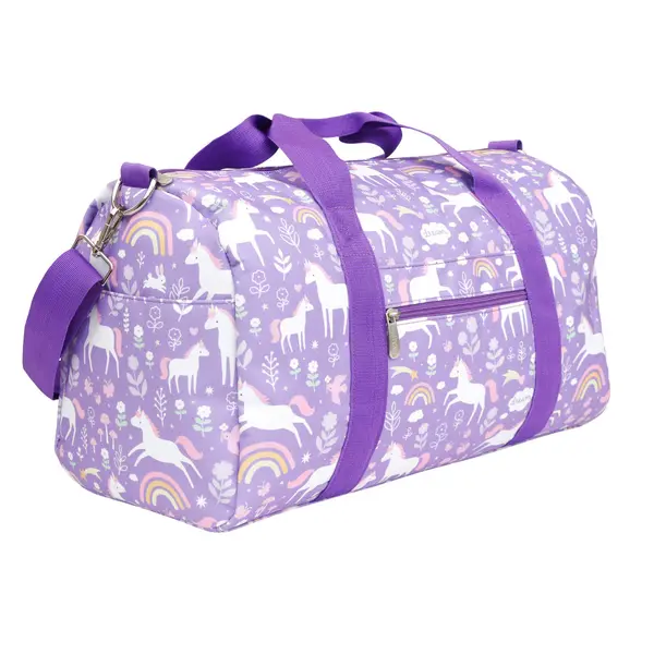 A Little Lovely Company | Unicorn Dreams Weekend BagDe ruime, paarse weekendtas met eenhoorns, bloemetjes en regenbogen is ideaal voor vakantie, logeerpartijtjes of als sporttas. Deze veelzijdige tas heeft een dubbel hengsel en een verstelbare, afneembare