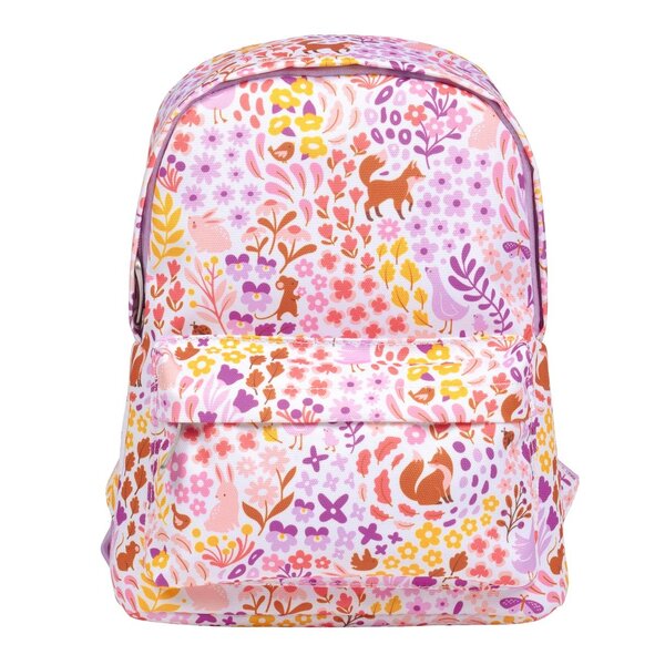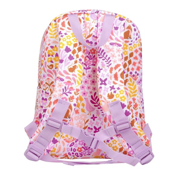 The small, lilac backpack with flowers and foxes is ideal for taking to school or daycare. The toddler backpack has a spacious main compartment and a front zip pocket. The backpack also features padded shoulder straps and back panel. The backpack also has a chest strap, so it won't fall off the shoulders so easily.
