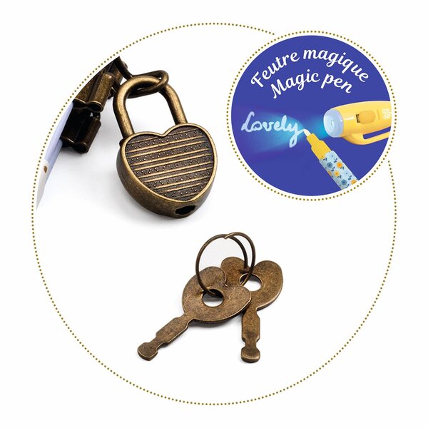 A secret notebook with an invisible ink pen to write down all your secrets and draw pictures! Shine a UV lamp over it and all your secrets will be revealed. This notebook has 88 lined pages, all illustrated with little drawings. It has a heart-shaped lock and two keys to protect all your stories from prying eyes. Lovely Paper by Djeco, a collection of refined and delicate stationery with beautiful illustrations to brighten up the daily lives of young and old.