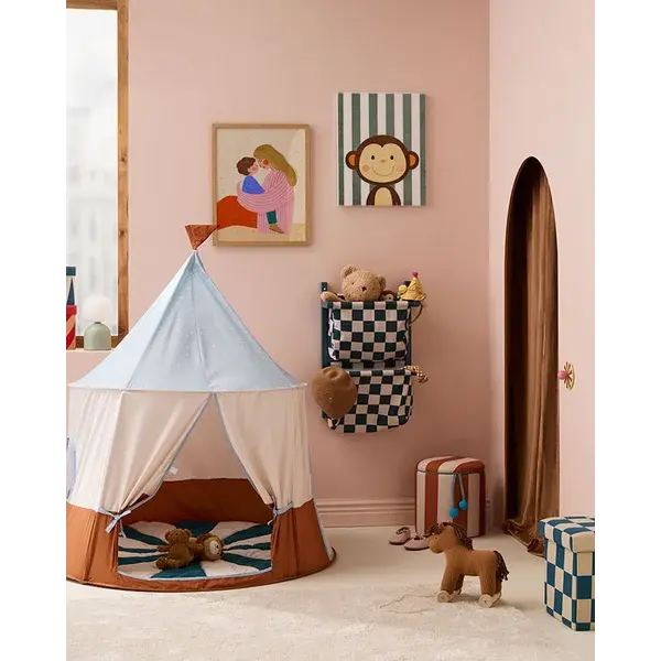 Turn any room into a circus wonderland with this large, decorative, reversible play mat – designed to fit perfectly inside the Circus Tent, or to be used on its own wherever a soft surface is needed. The Circus play mat is padded and filled with recycled polyester, and covered in soft cotton fabric. The front features a striking, graphic striped pattern inspired by circus themes, whilst the reverse is a plain off-white. It’s also great on its own – on the bedroom floor for play, as a base for a baby gym, or in the living room for a cosy reading nook. Please note: you can use a non-slip mat if the mat is placed on a smooth floor for older children, but do not use this for babies who are crawling, sitting or lying down. The mat is machine washable at 40°C and OEKO-TEX certified.