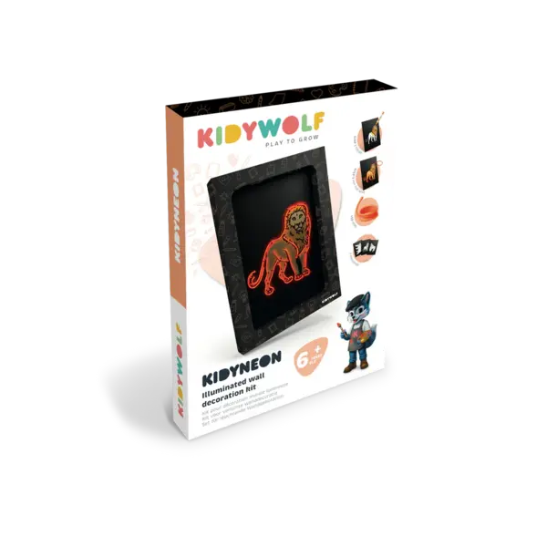 - Contents: KIDYENON set, 3 pre-perforated boards with the theme: Animals, 1 neon wire in orange, Battery powered (not included), Instructions for use