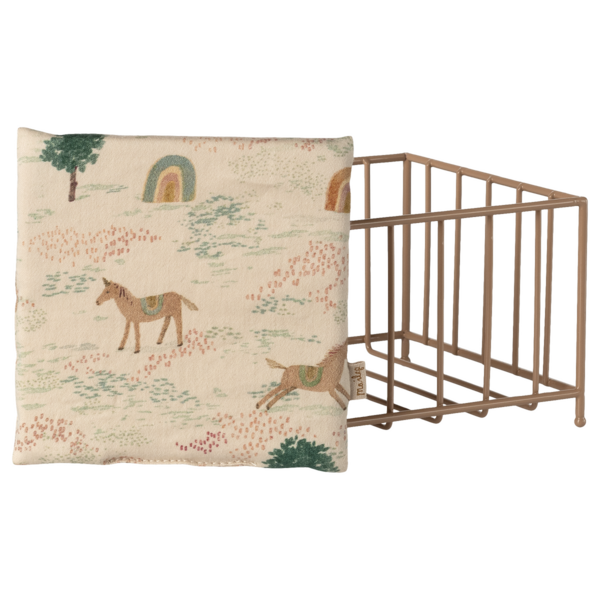 Keep your baby safe in an adorable playpen. This size fits perfectly with all friends in size My and baby mouse. The playpen is made of metal and painted in a pink shade. The bottom has a soft mattress covered with unique Maileg fabric.