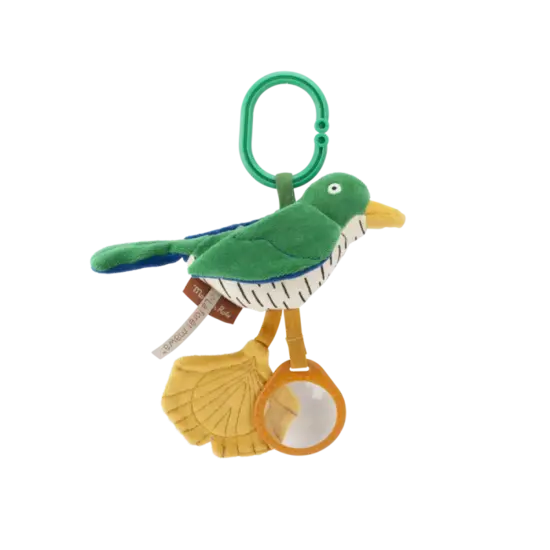 Hanging cuckoo with a bell in its tummy and equipped with a mirror and a magnifying glass. It is dressed in the colours of the Mawa forest and has wings to rub, so babies can develop their senses while having fun!
