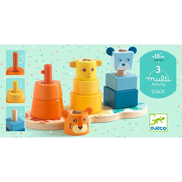 Multi Stack is a wooden toy that allows children to discover three different ways of stacking. Each pyramid represents an animal in a different colour, and each axis requires a different action: the child stacks on the smooth axis, turns on the spiral axis and tilts on the key axis. There are three animals to discover: a monkey, a lion and a bear.