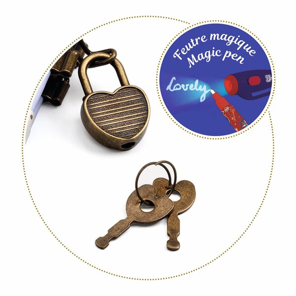 - Contents: 1 secret notebook (10 x 13.5 x 1 cm), hard cover with print, 1 lock + 2 keys, 88 lined pages (120 g/m² paper) + 1 magic pen with on/off button that works on 3 included LR44 HD batteries.