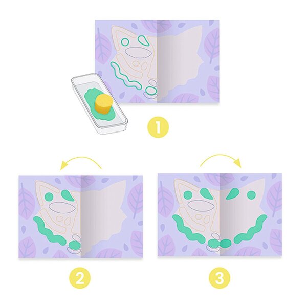 A paint box to reveal and colour 4 large animals. After protecting the table with the tablecloth, the child applies the paint to one side and folds the sheet. He/she presses and when the sheet is unfolded again: surprise! The animal is now complete and painted! When the paint is dry, the child decorates his/her sheet with the stickers.