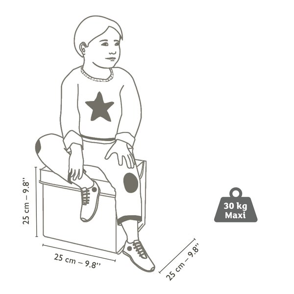 A colourful toy chest with a Bohemian style. A nice decorative item to keep everything tidy! Sturdy thanks to its wooden structure and can be transformed into a child's seat (max weight: 30 kg).