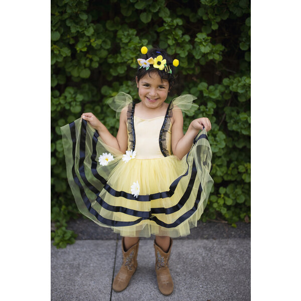 Little ones will be buzzing with excitement over our new Bumble Bee Dress & Headband. The yellow dress features black jewel & a beautiful iridescent spandex top and a black & yellow striped tulle skirt with floral embellishments. Also included in the set is a bumble bee headband with pom-pom antennae and garden-inspired designs. Pair it with our Bumblebee Wings & Headband set for a garden-ready look.