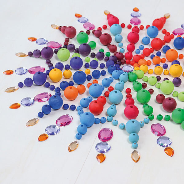 A pack of 60 wooden beads in beautiful rainbow colours. Wooden beads are one of the most basic play materials for children. While threading, eye-hand coordination is stimulated and fine motor skills are trained.