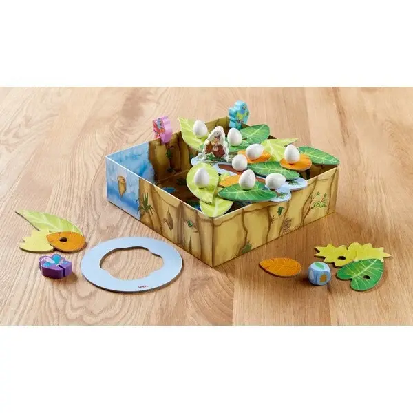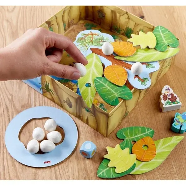 Miss Vulture has laid so many eggs that they won't fit in her nest at all! Will you help her build a bigger nest? In this fun cooperative family game from HABA, you work together to place leaves. Above the box, you try to stack the leaves so that there is enough room for all of Mrs Vulture's eggs. But watch out! Because the cheeky parrots also demand space for their nests. If you manage to expand the nest for Mrs Vulture, you will win the game together. Mrs Vulture! is a super funny and beautifully designed game for children aged 3 and up, but which you can play with the whole family. The physical aspect also playfully promotes fine motor skills, and the rest of the game teaches cooperation and social skills. A perfect gift for game fans with nerves of steel!