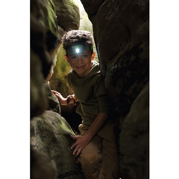 Tough, easy-to-wear headlamp with white and red LEDs. Choice of continuous light and flashing signal light. In addition, splash-proof and with adjustable angle. Complies with all applicable standards for children's lamps. Supplied EXCL. batteries (3x AAA). Made of polyester, nylon and plastic.