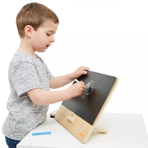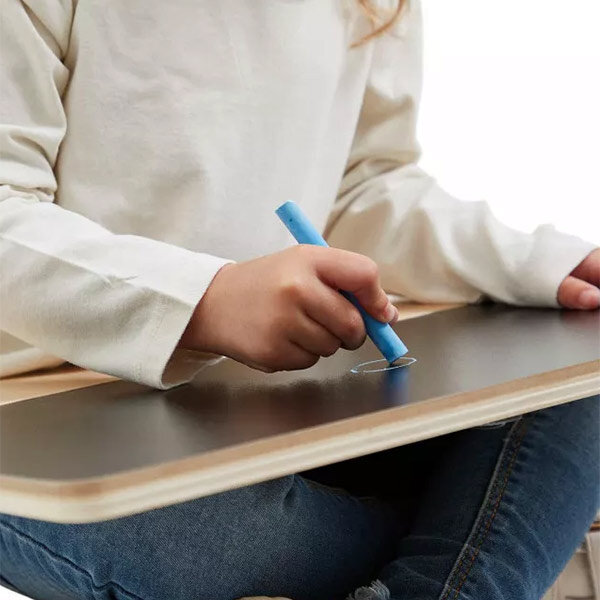 With its handy size and removable base, this chalkboard is the ideal writing tablet for children aged 3 and over. Easy to carry, install and clean up. Simply fold the base of this blackboard by removing one of the two press studs on the fabric handle. This chalkboard in timeless slate style, supplied with 3 chalks and 1 brush, develops children's imagination and creativity.