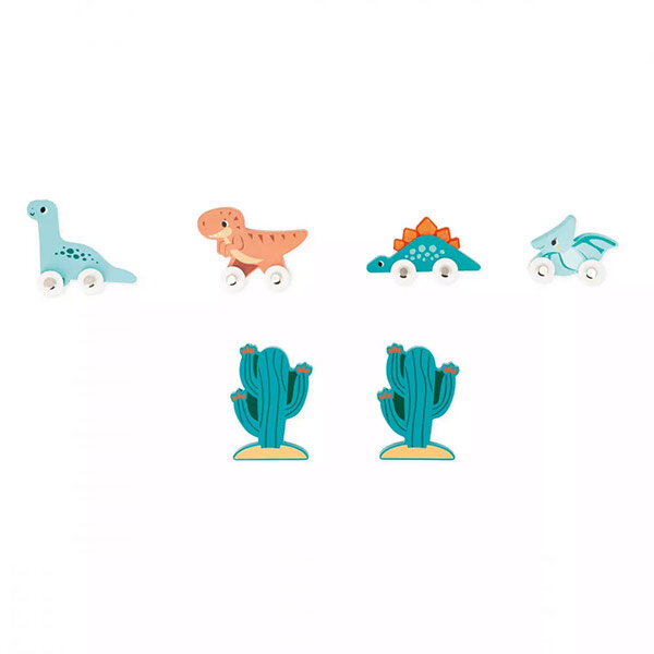 - Contents: 4 rolling wooden dinosaurs, 2 cacti, moving elevator with platform