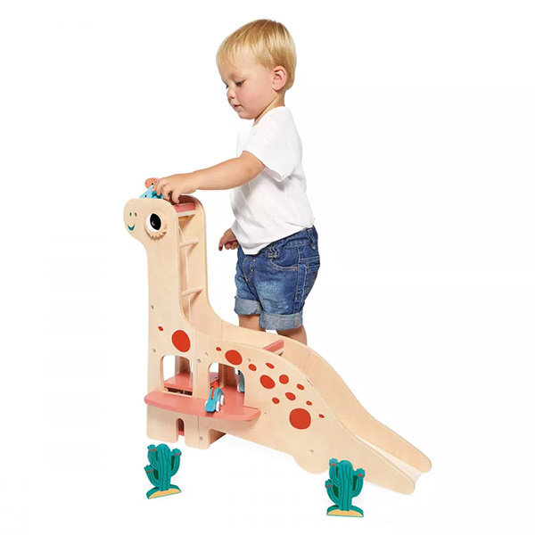 How cool is this Dino toy car garage? The ideal garage for children from 2 years. This 50 cm high wooden garage is equipped with a lift that gives direct access to the first and second floors, up to the head of the cute dino. Place the vehicles on the platform and turn the big round eyes to control the lift. You come down via the spectacular slope that runs along the long neck and back of the dinosaur. This toy car garage is ideal for developing motor skills and imagination.