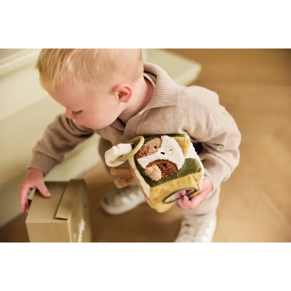 This soft activity cube from the Tiny Park collection is an enchanting toy for your little one. With cute animals such as a cat, dog and owl and interactive elements such as crackling ears and a mirror, it stimulates your baby's senses and motor development. A cheerful and educational cube, perfect for hours of fun in the playpen or on the go!
