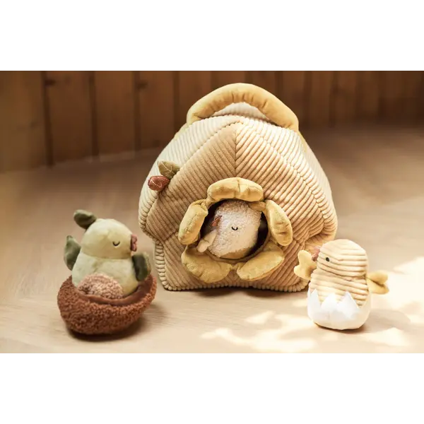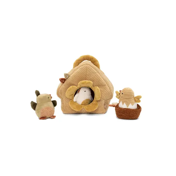 The set includes three adorable birds – Lulu, Chirp and Feather – that can be hidden in a large birdhouse. This house is beautifully decorated with leaves, has a playful flower opening and a crackling sound for extra fun. Lulu is a little explorer who is always looking for a new adventure. Chirp is a cheerful singer who makes little tweets and happy sounds all day long. Feather is a playful bird who loves to dance through the air. Thanks to the handy handle, you can take the birdhouse with you wherever you go. A perfect (maternity) gift for curious little ones!