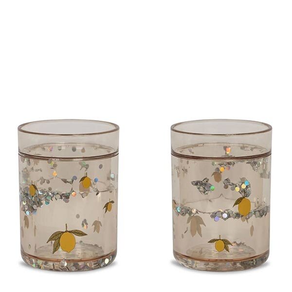 Set of 2 glitter drinking cups in Lemon design. These cups add fantasy and playfulness to the dining table. They encourage young children to drink more. It is best to wash the cups by hand and not in the dishwasher so as not to damage the double-sided wall.