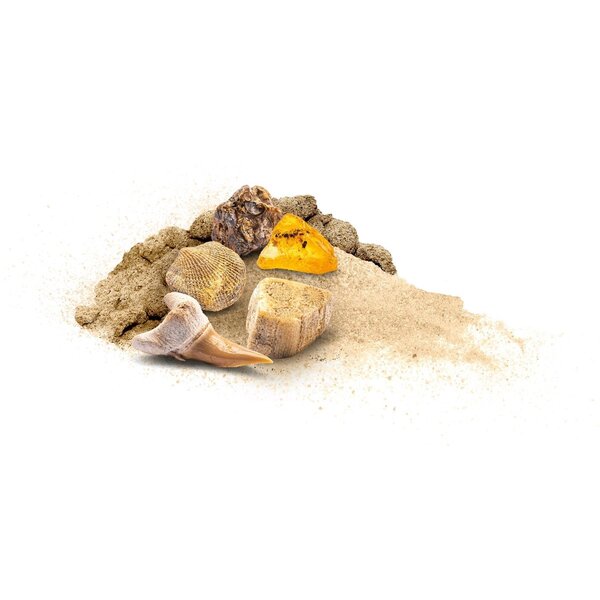 - Contents: Plaster block with 5 of the 8 possible fossils (ammonite, fenestella, atrypa shell, stone coral, crinoid, sea lily, fossil wood, fossil resin (copal), hammer, chisel, sponge, colourful illustrated instructions