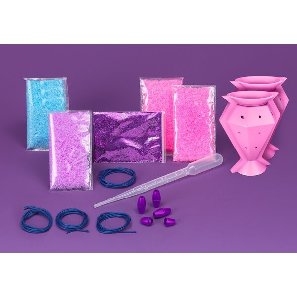Wonderful everything is in pink, blue and purple! In just a few minutes, unique pendants in the shape of a diamond are made and decorate necklace, dream catcher or bracelet. Small jewelry designers stir together the special granules in different colors and put the mixture into the two crystal pendant molds. Exciting!
