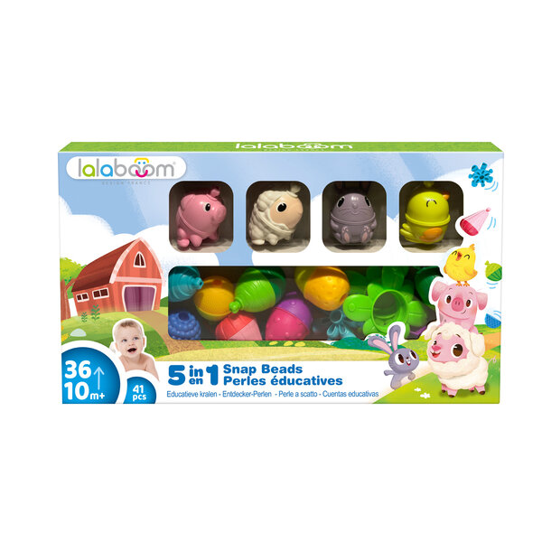 Educational beads including 4 animal beads (sheep, chicken, rabbit, pig). 41 pieces. Suitable for children aged 10 months to 3 years. Your child can connect the beads and all other Lalaboom toys together for endless play possibilities. The Lalaboom beads are dishwasher safe.