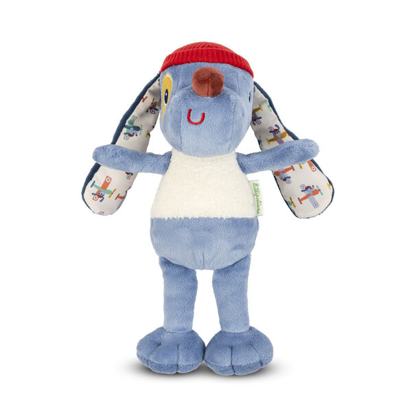 Adopt Jules! This adorable plush dog is suitable for children and babies from 3 months old. Presented in its beautifully illustrated box, it is the ideal gift for a birth, birthday or any other occasion to spoil a little one! This soft and colourful dog cuddly toy has different textures that are as pleasant to the touch as they are stimulating for the baby to explore: grooves on his red hat, embossed embroidery on his face, a super fluffy white cardigan... As for her ears, they are decorated on the inside with a beautiful print featuring aeroplanes. Why? Because our Jules is a pilot's dog par excellence! Of course, he also loves DIY, gardening and cuddling. Jules' long ears and large feet are extensions that are easy for little ones to grab and cuddle. This is also the cause of our dear friend's clumsiness, which makes him even more endearing. The blue tones of this Lilliputiens cuddly toy make it so soothing! Jules will brighten up your little one's room and nights. He is a loyal friend, cute and full of personality! It encourages affection and stimulates children's senses and imagination. This cuddly toy is 27 cm long, an ideal size for maximum cuddles from little ones. Thanks to the beautifully decorated box, you can be sure of offering a gift with the most beautiful effect. In addition, the gift box can be reused to store your child's belongings or souvenirs. This blue cuddly toy is made of polyester and can be machine washed at 30° for easy maintenance. All that remains is to cover Jules with kisses!