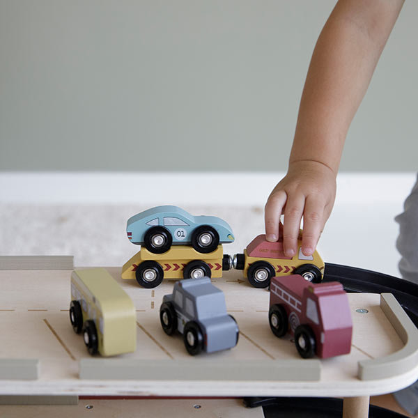This vehicles set provides hours of fun. The set consists of 9 different vehicles, including an ambulance, a fire truck, a police car and a racing car. These wooden service and emergency vehicles are designed to be used in combination with the Little Dutch wooden railway train set. The tyres are compatible with the rails, allowing the vehicles to drive around town and be of assistance where they’re needed. Complete the vehicles with the railway train XXL set and additional extension sets for hours of fun play. Made of durable and FSC certified wood. No rails are included in this set.