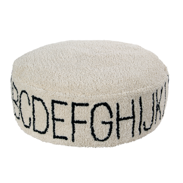 Round wide pouffe in Natural base color and with the letters of the Alphabet in black all around the side. Top and sides covered with soft rug pile, bottom part in cotton canvas, and finished with a zipper. Inside removable filler with polystyrene pearls.