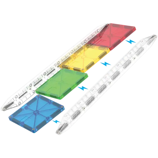 Build, race and roll with the MAGNA-TILES Rail Racers Deluxe 90-piece set! The Rail Racers Deluxe 90-piece set offers children of all ages action-packed fun and endless creativity. With patented transparent rails and innovative microMAGS pieces, children can easily design dynamic race tracks, ramps, bridges and towers for non-stop racing fun. The Rail Racers are easy to assemble without pins or connectors and click together effortlessly – four clicks and you're ready to play!