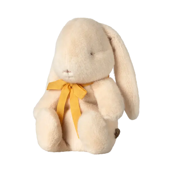 This bunny is made of very soft and unique plush fabric. It has a pretty bow around its neck. It looks very sweet and will soon be someone's best friend.