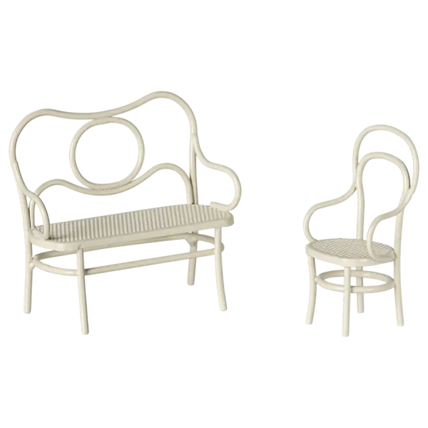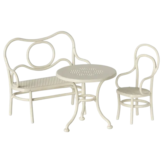 Café set furniture to match the Little sister/brother and Big sister/brother mice. The set includes a bench, a chair and a table, and is a perfect place to enjoy afternoon snacks.