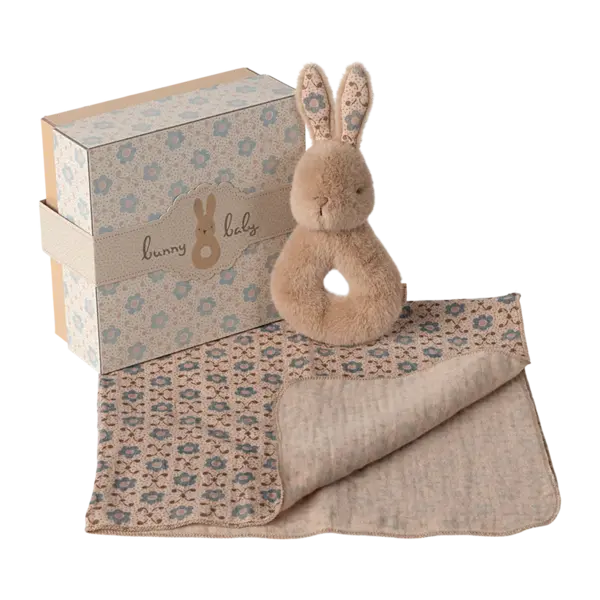A perfect gift idea for little ones. The set consists of a soft cotton cloth and a small bunny rattle. Inside the bunny is a small rattle that makes a soft sound. It all comes in a pretty gift box.