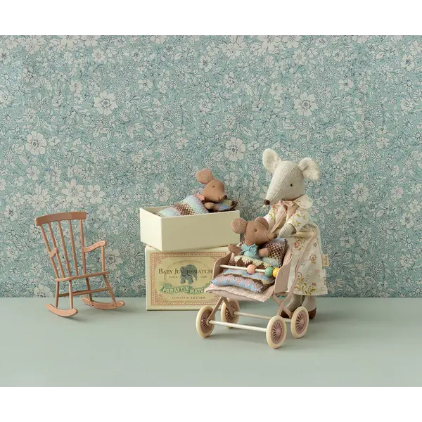 A classic Maileg article. This mouse is ready for hours of playtime and sleeps delightfully in the matchbox. The clothes and bedding are made of soft fabrics with unique prints in beautiful colours.