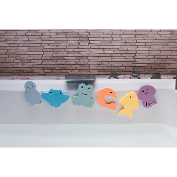 With this fun Waterfun jumbo set consisting of 6 recognisable animals from the underwater world, children will have the most fun adventures in the bath, shower, pool,... . The manta ray, jellyfish, goldfish, frog, shrimp and the penguin take you on the most fun underwater adventure. The animals can stick to the bath or shower wall , you can build a raft by stacking the figures and much more with this unique Waterfun Jumbo set from MOES.