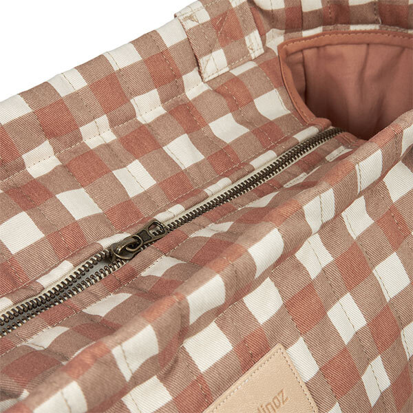 This tote bag in beautiful Terracotta Checks design from the Nobodinoz Hyde Park collection is super stylish. A large spacious bag, in which you can store everything easily and efficiently! Ideal for use as a diaper bag, tote bag and travel bag. You can easily hang this bag over the shoulder or on the stroller.