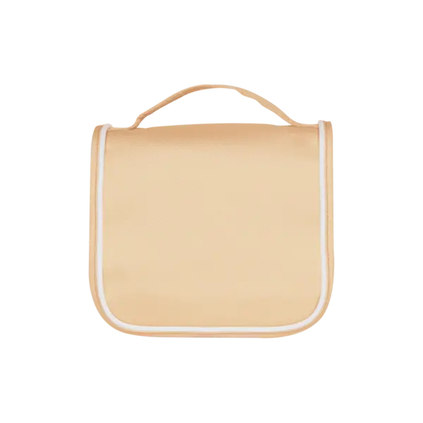 - The toiletry bag's water-resistant fabric exterior is made of recycled PET and finished with brass.