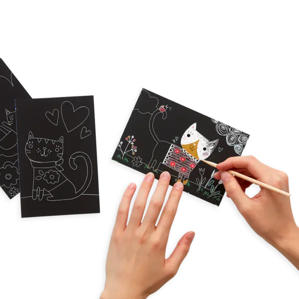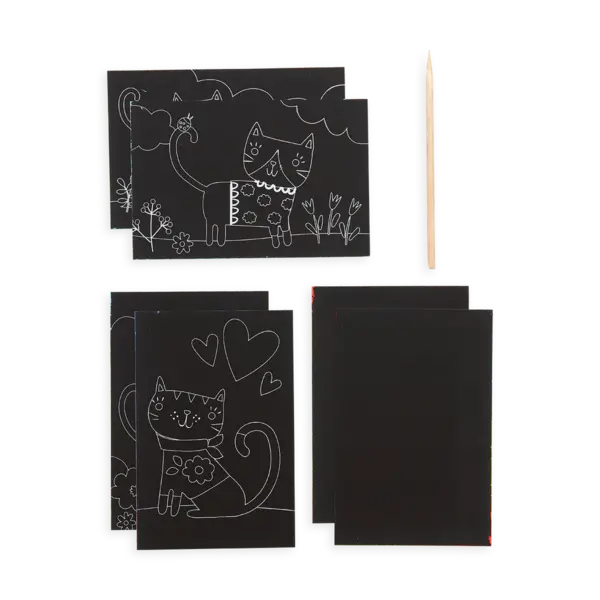 Discover adorable cats as you scratch and scribble over the illustrated guidelines in this mini scratch art kit. Cutie Cats includes 4 illustrated cards and 2 DIY rainbow cards plus a handy wooden stylus for incredible scratch art fun! Each activity kit contains everything you need to create DIY art.