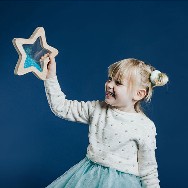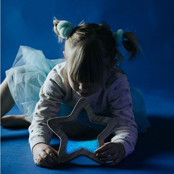 With the sensory star Orionis from Petit Boum you have a small piece of the galaxy at your fingertips. All the magic from Petit Boum's sensory bottles has been incorporated into this star-shaped sensory toy. This sensory star is filled with colorful and above all safe fluorescent (Glow In the Dark) liquids with glitter that glow in the dark. Shakes the star to stimulate the imagination. Let the movement and light effects of the liquid, glitter and stars amaze and calm you.