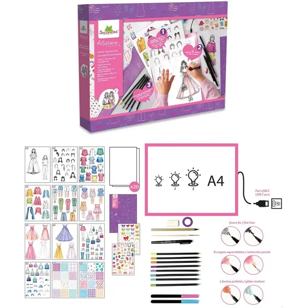 • Contents: 12 pre-drawn models for easy styling, 20 white A4 sheets, 8 watercolour pencils to create magical watercolour effects, 2 glitter markers (pink and blue) to add elegant and sparkling details, 1 black fine liner with double tips for perfect contours, 1 brush, 1 HB pencil, 1 eraser, 2 A5 sheets of stickers to personalise each outfit, 1 bag to collect the models and their creations, 1 A4 light tablet (3 intensity levels) + USB cable and an instruction booklet. An ideal product for budding artists and fashion enthusiasts!