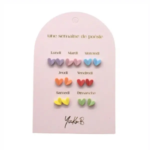 7 pairs of ceramic and stainless steel earrings with one pair per day of the week. Each set comes in a beautiful gift envelope.