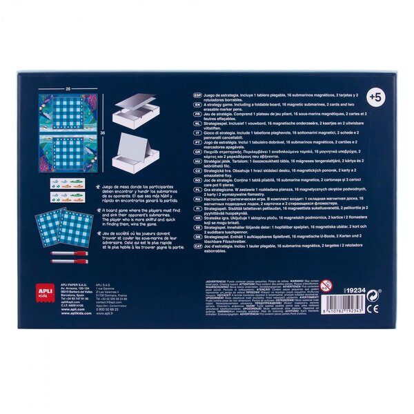 - Contenu : 1 plateau de 28×36,5 cm qui se range dans le fond de la boîte, 16 sous-marins magnétiques, 2 cartes et 2 marqueurs effaçables.