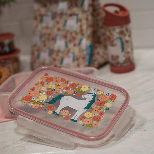 La boîte à lunch Unicorn est une boîte à tartines pratique avec 3 compartiments. La disposition garantit que vos sandwichs, fruits et biscuits restent bien séparés. Le lunch box est simple et facile à fermer grâce au système de clic sur les côtés. Des collations saines, des sandwichs savoureux, tout reste bien rangé dans cette boîte à lunch pratique. Complétez le déjeuner et combinez cet lunch box amusant avec le gourde assorti.