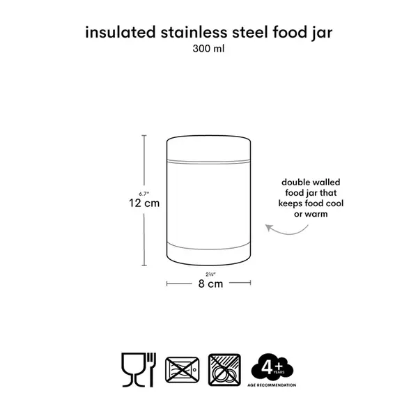 Ce pot isotherme en acier inoxydable est idéal pour tous ceux qui aiment emporter un repas chaud ou une collation fraîche à l'école ou lors d'une sortie. Fabriqué en acier inoxydable, ce pot est à double paroi. Avec une contenance de 300 ml, il est suffisamment grand pour contenir une délicieuse collation chaude et suffisamment petit pour se glisser facilement dans un sac à dos avec la boîte à lunch et la gourde assorties.