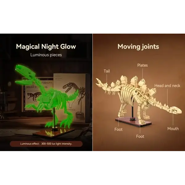 Construisez votre propre fossile de stégosaure et donnez vie à ce dinosaure légendaire qui a vécu il y a 155 à 145 millions d'années. Le set comprend 297 pièces, dont des éléments fossiles qui brillent dans le noir, pour un effet sympa, surtout la nuit. La construction dispose également d'articulations mobiles (tête, pattes et queue) afin que vous puissiez placer votre stégosaure dans une pose encore plus impressionnante.